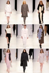 Sleek, clean silhouettes in black, white, and gray—paired with one or two loud elements like sculptural jewelry, exaggerated collars, or metallic belts.